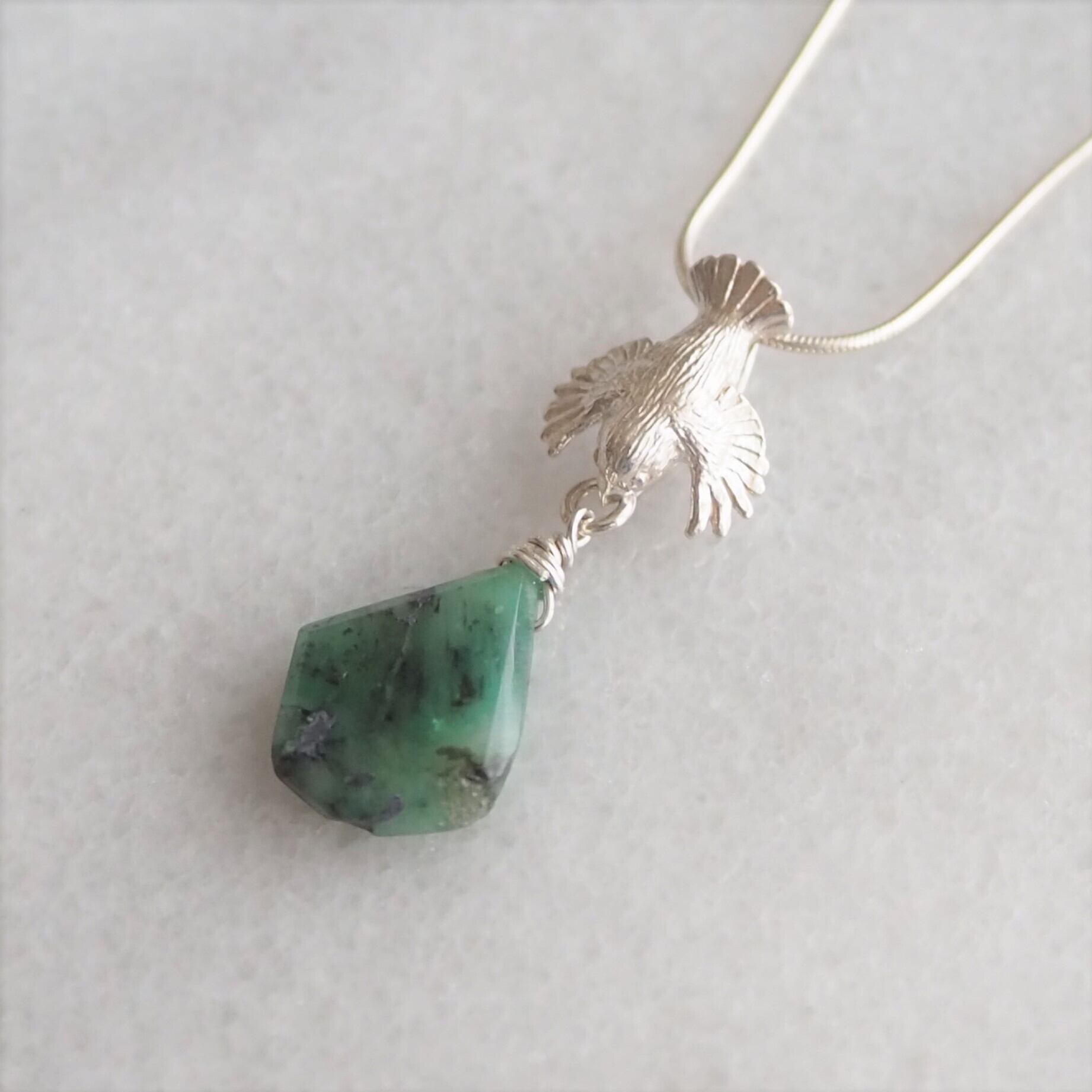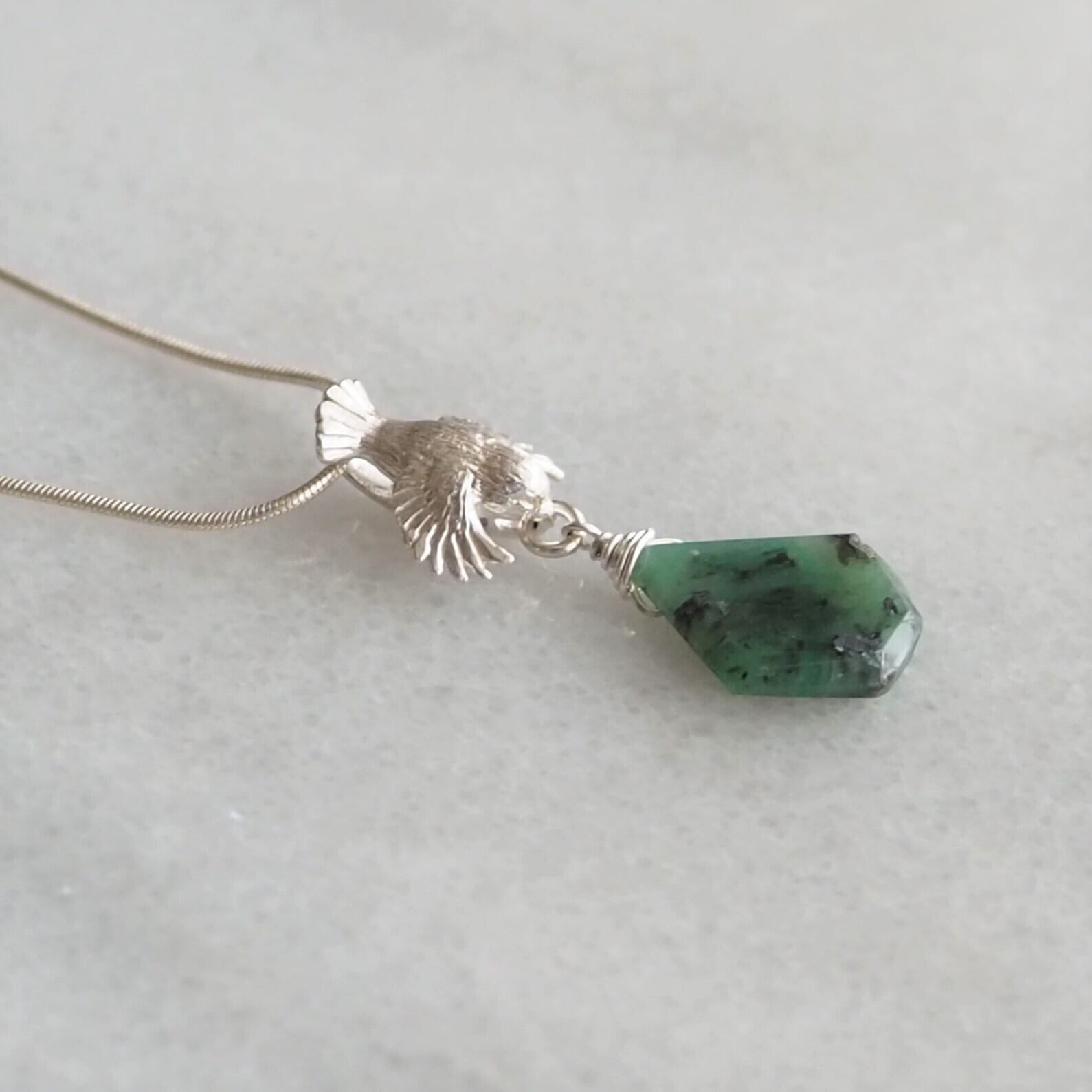 スズメがエメラルドを運ぶペンダント。