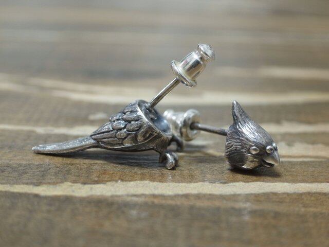 オカメインコのかわいいお顔とお尻がピアスになりました。耳に着けると、まるでかくれんぼしているようです。